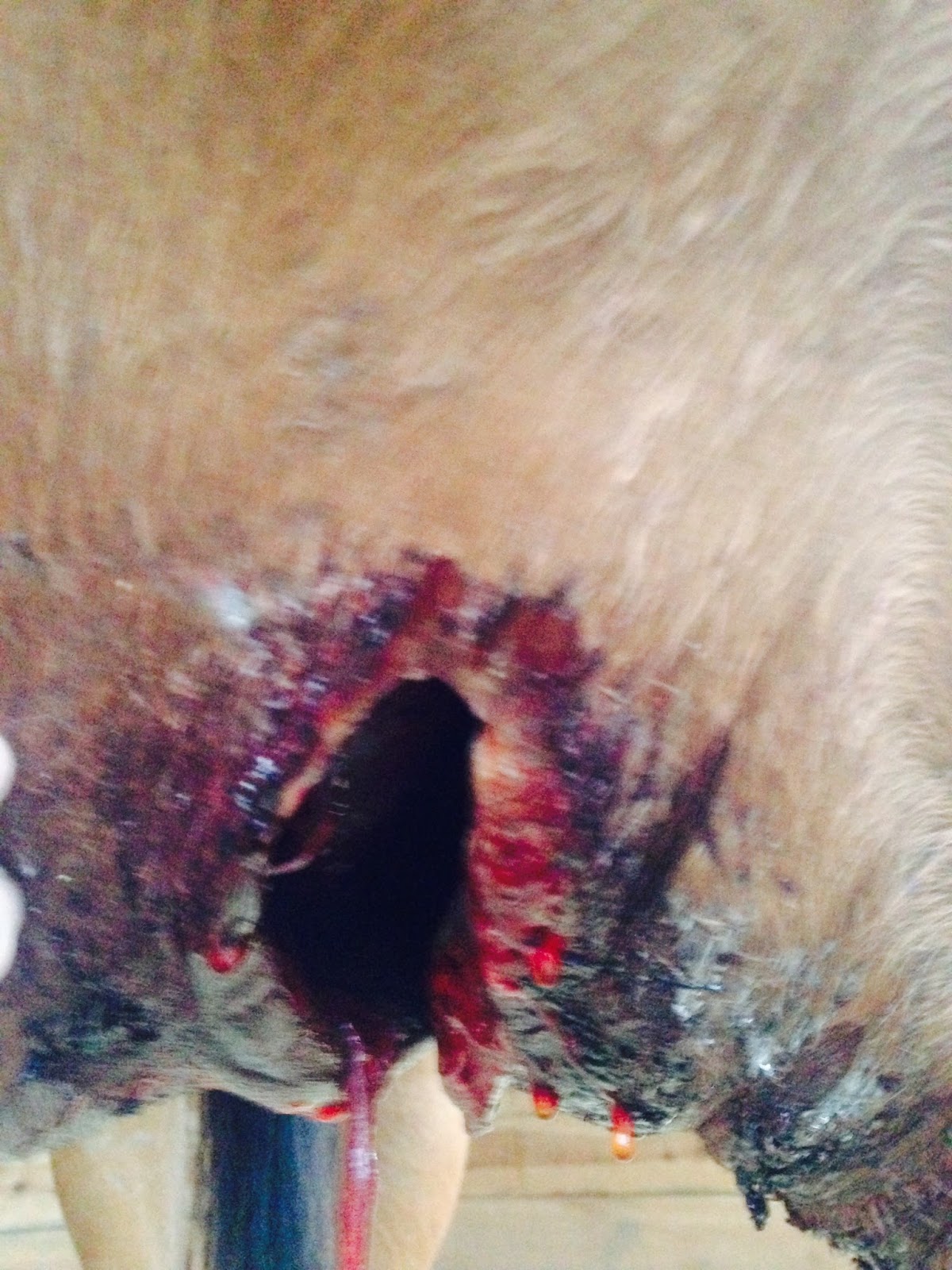 torn gaskin, a punctured stifle, a probable torn ACL, and a litany of scrapes and cuts. My vet